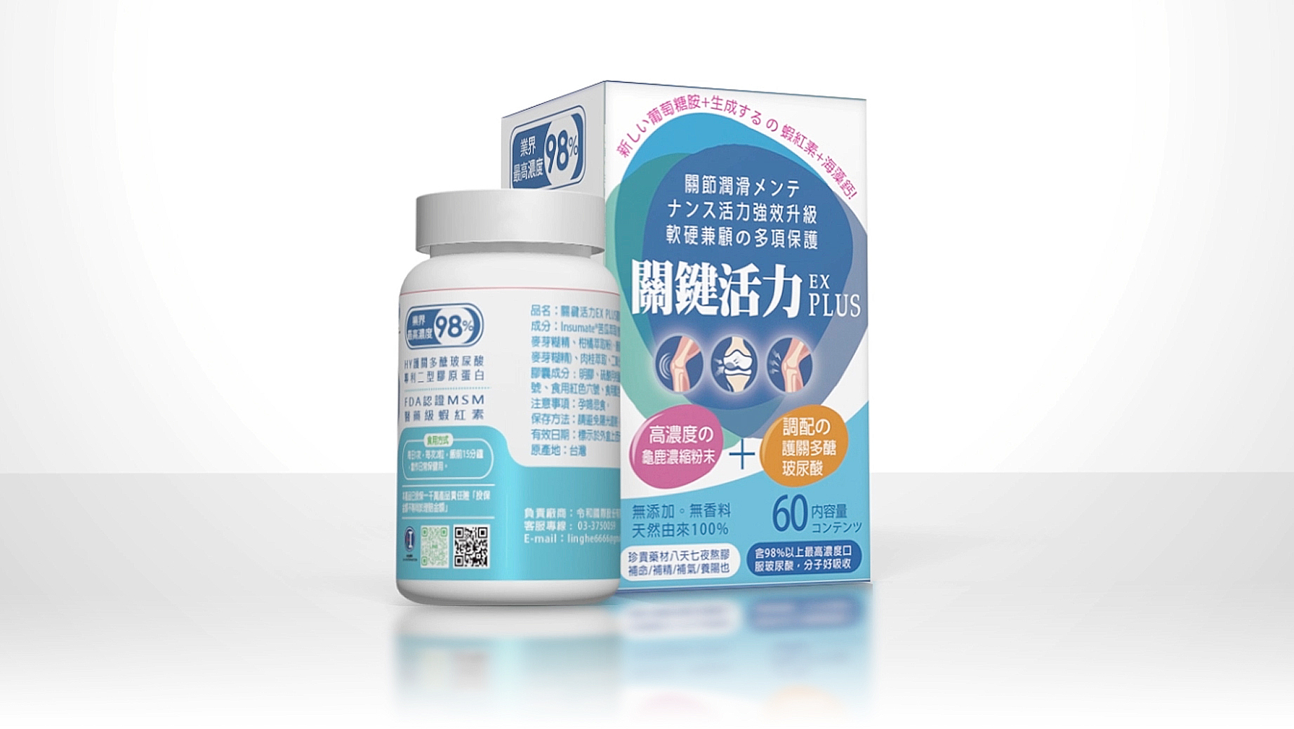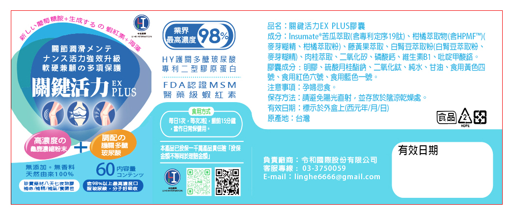令和生醫-關鍵活力-EX-PLUS-產品說明: 強健骨骼,關鍵活力,強效升級。HY護關多醣玻尿酸,專利二型膠原蛋白,FDA認證MSM,醫療級蝦紅素,高濃度龜鹿精華,八天七夜熬膠。