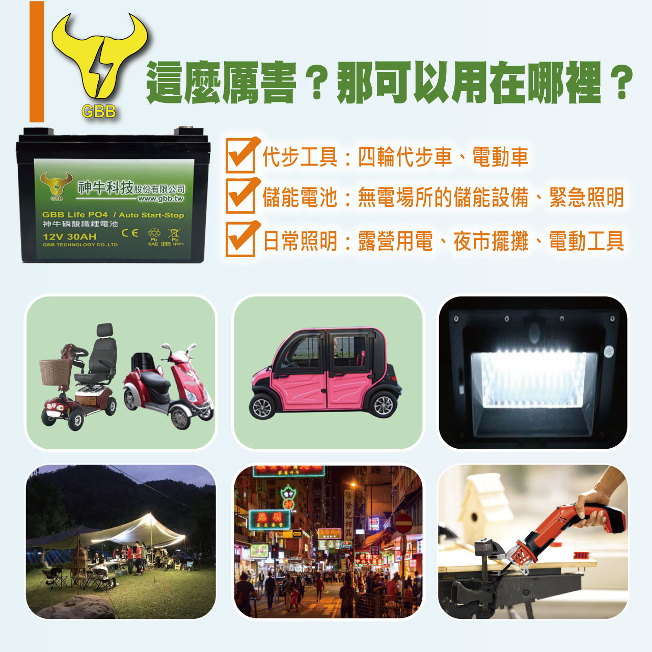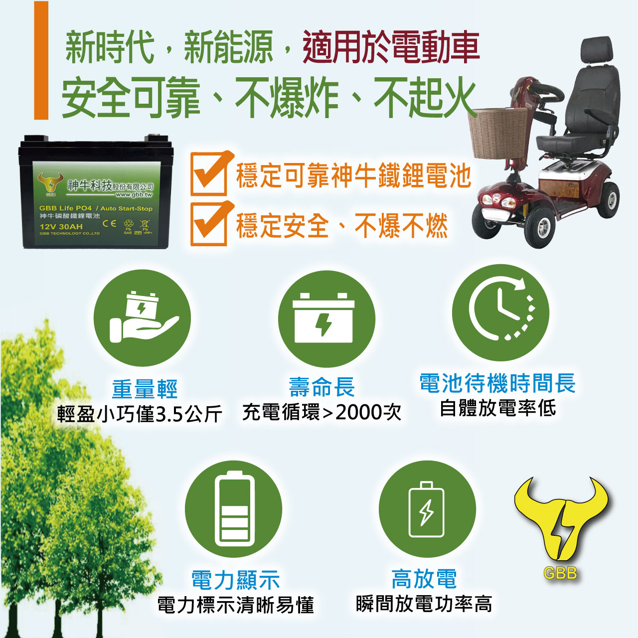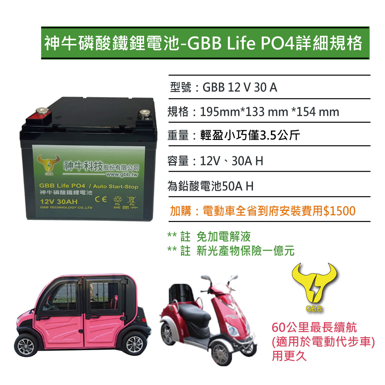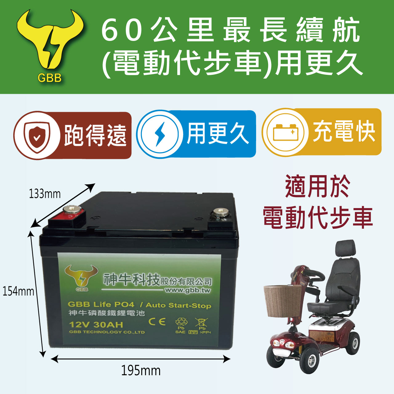 台灣監製工廠直輸|電動車代步車專用電池和儲能電池 【2024神牛磷酸鐵鋰電池 12V、30A大容量上市】# ➤三合一儲電怪獸,超長壽命+低自放電+快速充電 ➤電動代步車專用電池 ➤特斯拉同款電芯材質,給您滿滿的「用電自由」 ➤受夠每天一定要充電嗎?# 一旦忘記充電,行程必定會被拖延,太困擾了! 【神牛磷酸鐵鋰電池,12V3 0A大電量設計】 騎行30公里只是基本性能,沒想到最長可以續航60公里, 幾乎可以從台北⟺桃園來回! 實測只要3~4天充一次電即可,不僅彌補電量小的缺憾,更讓您騎得久騎更遠、享受美好旅程! 採用「磷酸鐵鋰電芯」,快速充電即刻救援, 安全有保障!我要訂購